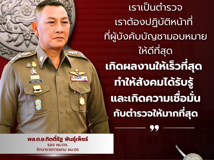 “เราเป็นตำรวจ เราต้องปฏิบัติหน้าที่ที่ผู้บังคับบัญชามอบหมายให้ดีที่สุดเกิดผลงานให้เร็วที่สุดทำให้สังคมได้รับรู้และเกิดความเชื่อมั่นกับตำรวจให้มากที่สุด” พล.ต.อ.กิตติ์รัฐ พันธุ์เพ็ชร์ รอง ผบ.ตร. รักษาราชการแทน ผบ.ตร กล่าวในการให้สัมภาษณ์สื่อมวลชน ก่อนการประชุมบริหารสำนักงานตำรวจแห่งชาติ ติดตามผลการปฏิบัติงาน และกำชับนโยบายการทำงานเพื่อดูแลความปลอดภัยในชีวิต และทรัพย์สินของพี่น้องประชาชนทุกมิติ เมื่อวันที่ 21 มีนาคม 2567 ที่สำนักงานตำรวจแห่งชาติ ( ตร. )