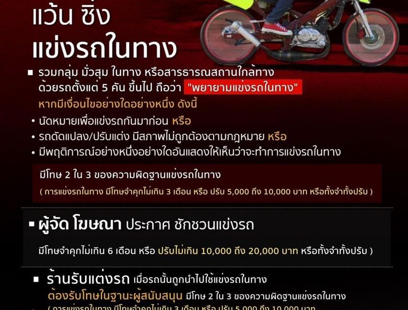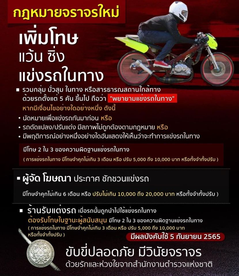 ระชาสัมพันธ์ กฎหมายใหม่ เกี่ยวกับการแข่งรถ ดัดแปลงสภาพรถ ครอบคลุมถึง ผู้ที่ชักชวนให้ผู้อื่นเข้าร่วม หรือ ตั้งตนเป็นผู้จัด รวมทั้งร้านหรืออู่ที่รับดัดแปลง ต่อเติม รถ เมื่อรถนั้นถูกนำไปแข่งในทาง มีผลบังคับใช้ตั้งแต่ 5 ก.ย. 2565 ที่ผ่านมาครับ
