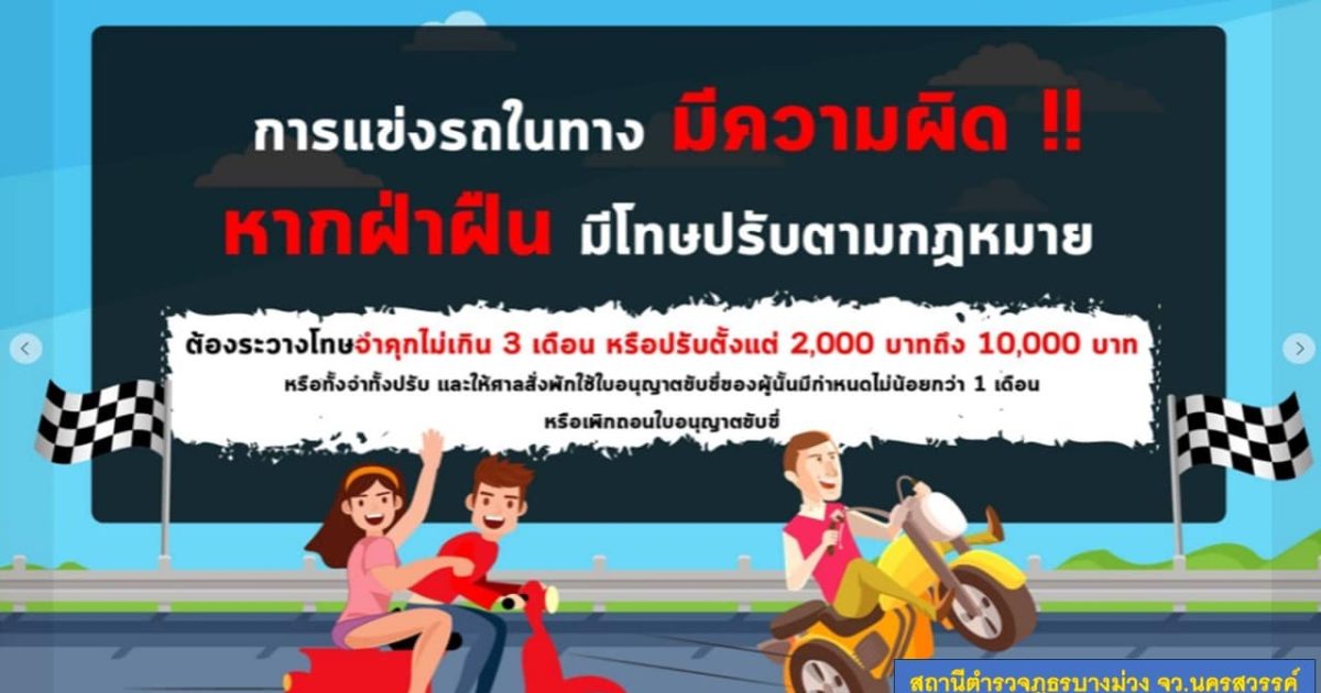 ประชาสัมพันธ์ การแข่งรถในทางมีความผิด ซึ่งมีโทษทั้งจำและปรับและผู้ปกครองต้องร่วมรับผิดชอบ ทาง สภ.บางม่วงมีความห่วงใยลูกหลานของท่าน อย่าปล่อยให้ลูกหลานของท่านฝ่าฝืนกฏหมาย และหากพบการกระทำผิดเกี่ยวกับแข่งรถในทาง แจ้งสภ.บางม่วง 191 หรือ โทร 056-276-200
