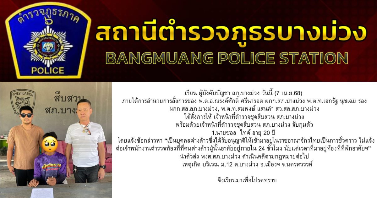 “เป็นบุคคลต่างด้าวซึ่งได้รับอนุญาติให้เข้ามาในอยู่ราชอาณาจักรไทยเป็นการชั่วคราว ไม่แจ้งต่อเจ้าพนักงานตำรวจท้องที่ที่คนต่างด้าวผู้นั้นอาศัยอยู่ภายใน 24 ชั่วโมงนับแต่เวลาที่มาอยู่ท้องที่ที่พักอาศัย ( พ.ร.บ.คนเข้าเมือง ม.37 (3) ม.36)“