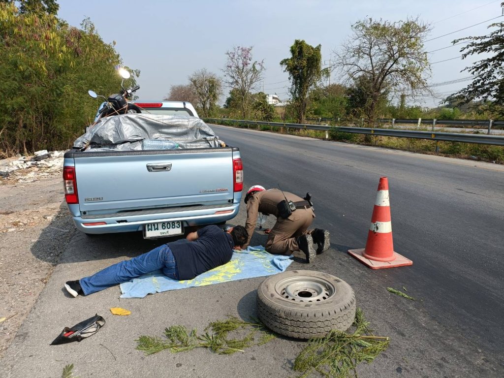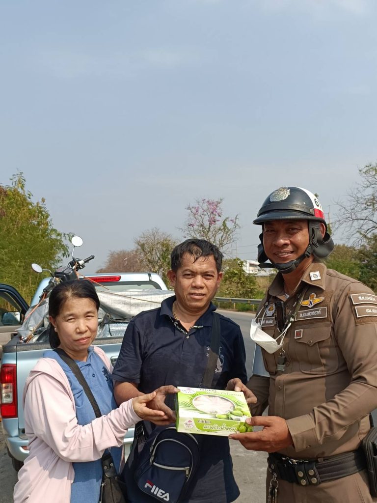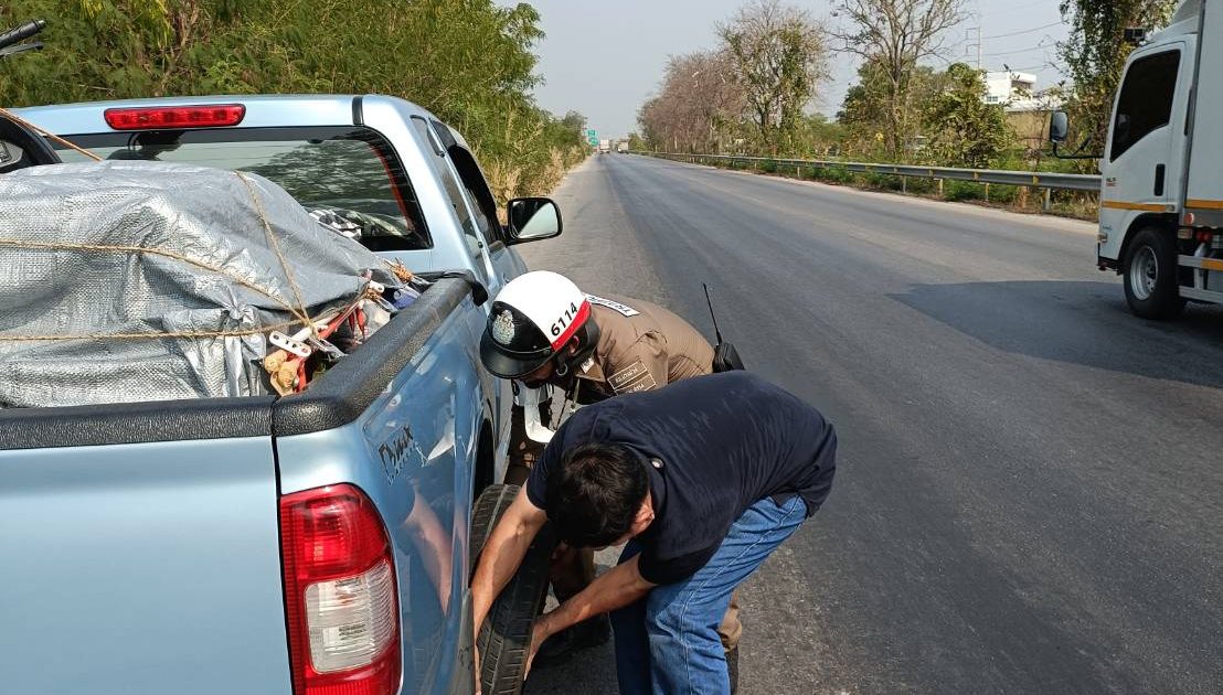 ด.ต.วิสุทธิ ทองอ่อน ผบ.หมู่ (จร.) สภ.บางม่วง ได้ให้การช่วยเหลือรถยนต์ได้เกิดยางแตก