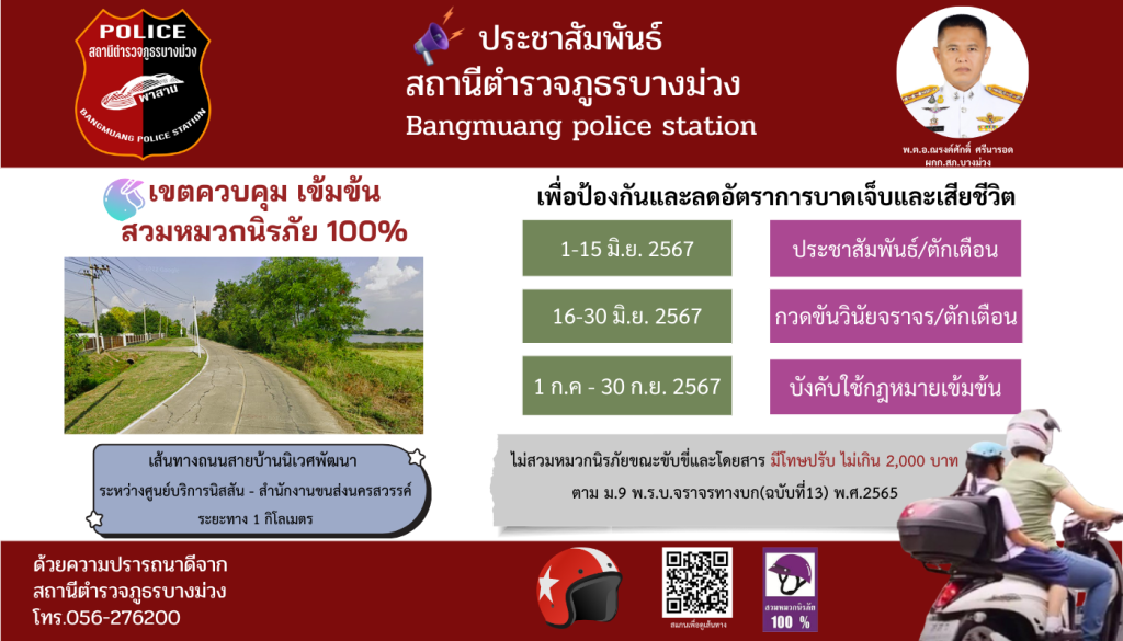 ประชาสัมพันธ์ งานจราจร สภ.บางม่วง ได้จัดทำโครงการ “ สวมหมวกนิรภัย 100% ”