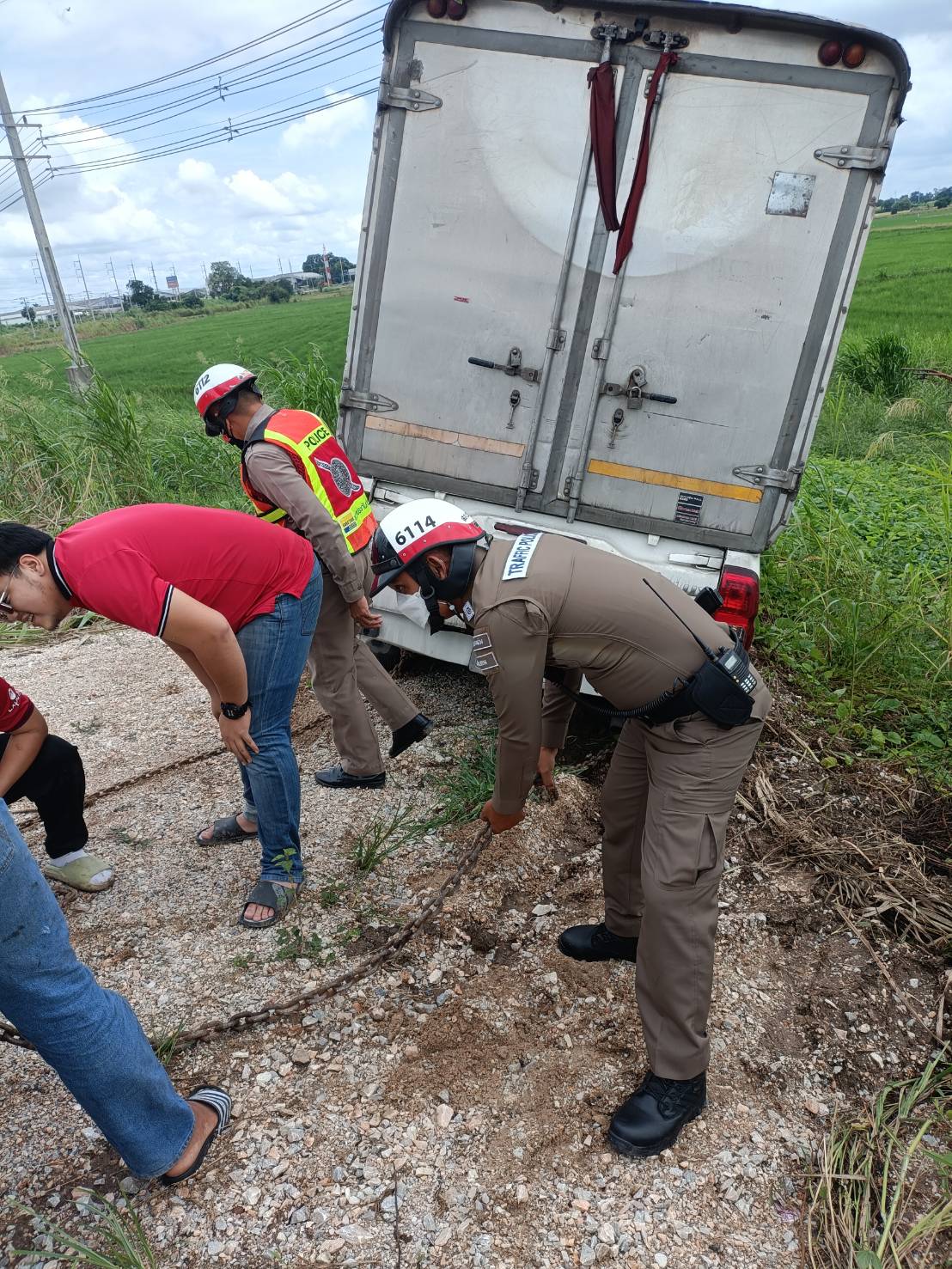 งานจราจร สภ.บางม่วง ช่วยเหลือรถกระบะตรกข้างทางเอง